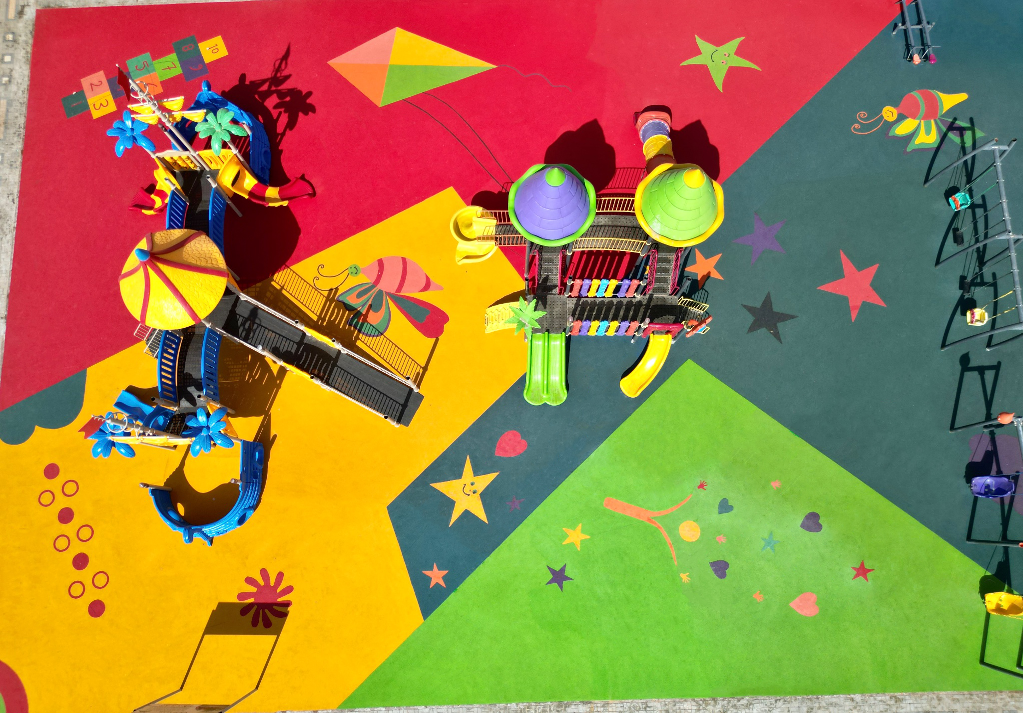 Safety flooring System ideal for schoolyards, playground, designed to absorb the impact of fall in the event of kids falling. It is applied on fine asphalt or smooth, moisture resistant concrete• Polyurethane primer applied by airless sprayer or brush.2 Mixture of polyurethane binder and SBR granules in granulometry of 1-3mm and a 20% mixing ratio.Applied by SMG paving machine.® Mixture of EPDM granules and polyurethane binder.This system is implemented by expert painters to apply kids designes and pattern
